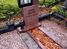 Так выглядит окончательный вариант места захоронения. В правую верхнюю часть надгробья мы установили заранее изготовленный элемент, на территорию участка досыпали каменную крошку, цветник наполнили мульчей.